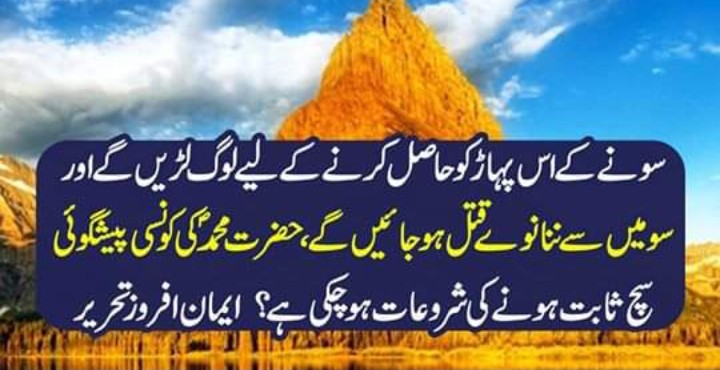آپ ؐ نے فرمایا، ” عنقریب دریائے فرات سے سونے کا پہاڑ نمودار ہوگا۔ جب لوگ اس کے بارے میں سنیں گےتو اس کی طرف چل پڑیں گے اور جو پہاڑ کے پاس ہوں گے وہ کہیں گے، کہ اگر ہم نے اسے چھوڑ دیا تو دوسرے لوگ اسے لے آئیں گے”۔ آپ ؐ نے فرمایا، ” پھر اس خزانے کو حاصل کرنے کے لیے لوگ لڑیں گے اور سو میں سے ننانوے قتل ہو جائیں (صحیح مسلم، کتاب الفتن، نعیم بن حماد)۔