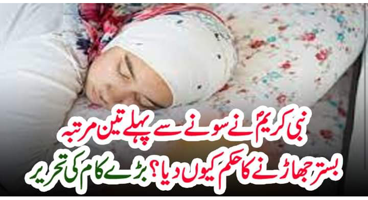 نبی کریم صلی اللہ علیہ وسلم کے احکامات اور سنت سے یہ ثابت ہے کہ سونے سے قبل اپنے بستر کو تین بار جھاڑ لینا چاہئے۔ بظاہر تو ایسا نظر آتا ہے کہ اس حکم کا مقصد بستر پر کیڑے مکوڑوں یا کسی اور نقصان دہ چیز سے صاف کرنا ہے لیکن سائنسی تحقیق میں ایسا ہوشربا انکشاف ہوا ہے کہ آپ بھی دنگ رہ جائیں گے اور بے اختیار سبحان الله کہہ اٹھیں گے کہ کس طرح نبی صلی اللہ علیہ وسلم کریم نے 14 سو سال پہلے ہی اپنی امت کو بچاؤ کی تدابیر بتا دیں۔سائنس کے مطابق انسانی جسم میں میٹابولزم کا عمل 24 گھنٹے جاری رہتا ہے جس کے باعث ہر پل سینکڑوں نئے سیلبنتے اور پرانے ٹوٹتے ہیں۔حیران کن بات یہ ہے کہ سونے کے دوران جسم میں ٹوٹنے والے سیل بستر ہی پر گر جاتے ہیں جو انتہائی چھوٹے ہونے کے سبب نظر نہیں آتے۔ اگر بستر کو بغیر جھاڑے اس پرسونے کیلئے لیٹ جائیں تو یہ مردہ سیل جسم میں داخل ہو کر کئی مہلک بیماریوں کا سبب بنتے ہیں اور سائنس نے بھی یہ ہی ثابت کیا ہے کہ ان مردہ سیلوں کو صاف کرنے کیلئے بستر کو کم از کم تین بار جھاڑنا لازمی ہوتا ہے اور ایسا کرنے سے خطرہ ٹل جاتا ہے۔