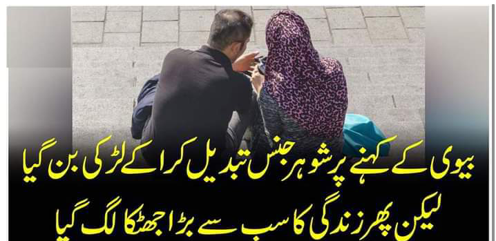تم میرا ایک عورت کی طرح خیال رکھتے ہو، اس لیے تمہیں اپنی جنس تبدیل کرا لینی چاہیے۔ مذاق میں کہی گئی اس بات کو شوہر نے زیادہ ہی سیریس لے لیا اور دونوں میاں بیوی ڈاکٹر کے پاس پہنچ گئے جس نے تقریباً ایک سال کے علاج کے بعد شوہر کو لڑکی میں تبدیل کر دیا۔ جب وہ مکمل طور پر لڑکی بن گیا تو اس کی بیوی نے