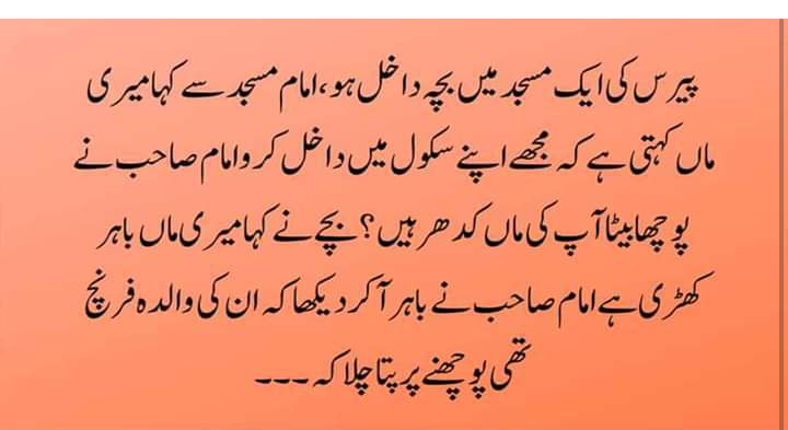 امام صاحب بہت حیران ہوئے اور پوچھا پھر آپ اپنے بچے کو مسلمانوں کی مسجد میں کیوں داخل کرنا چاہتی ہیں؟ تو وہ فرنچ عورت کہنے لگی