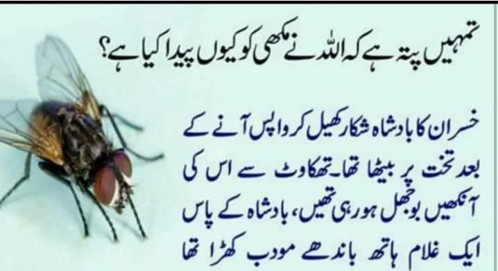 مکھی کے بارے میں ایک بہت سبق آموز واقعہ ہے۔ جیسے جو بھی سن لیتا ہے تو اس غلام کی باتیں جو جو اس نے اس وقت کی بادشاہ کو کی تھی ان کے دل میں بس جاتے ہیں۔ کیونکہ بعض اوقات کچھ باتیں ایسی ہوتی ہیں ۔ جو منہ سے نکلتی ہی لوگوں کے دلوں میں بس جاتی ہے۔ ایسا ہی ایک واقعہ خراساں بادشاہ کے ساتھ پیش آیا۔