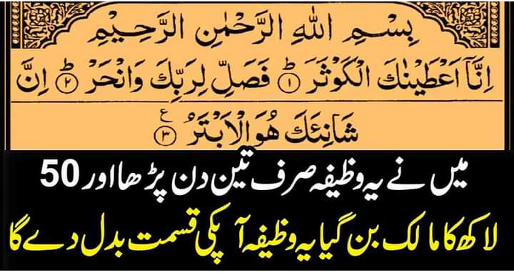ﻭﻇﯿﻔﮧ ﮐﺮﺗﮯ ﻭﻗﺖ ﭘﻮﺭﺍ ﺩﮬﯿﺎﻥ ﺁﭖ ﮐﺎ ﻭﻇﯿﻔﮯ ﭘﺮﺍﺷﮏ ﻧﮩﯿﮞ ﻠﮯ ﮐﮯ ﺁﻧﺎ ﭘﻮﺭﺍ ﺩﮬﯿﺎﻥ ﻭﻇﯿﻔﮯ ﭘﺮ ﺭﮐﮫ ﮐﮯ ﺁﭖ ﻧﮯ ﯾﮧ ﻭﻇﯿﻔﮧ ﮐﺮﻧﺎ ﮨﮯﺍﻧﺸﺎ ﺀ ﺍﻟﻠﮧ ﺍﺱ ﻭﻇﯿﻔﮯ ﮐﻮ ﮐﺮﻧﮯ ﮐﮯ ﺑﻌﺪ ﺁﭖ ﮐﯽ ﺍﻟﻠﮧ ﺳﮯ ﻣﺎﻧﮕﯽ ﮨﺮ جائز ﺩﻋﺎ ﻗﺒﻮﻝ ﮨﻮﮔﯽ۔ ﺳﻮﺭﮦ کوثر ﮐﯽ ﭘﮩﻠﯽ ﺁﯾﺖ ﭘﺎﮎ* ﺍﻧﺎ ﺍﻋﻄﯿﻨﮏ ﺍﻟﮑﻮﺛﺮ *ﮨﮯﯾﮧ ﺁﯾﺖ ﭘﺎﮎ ﺑﮯ ﺷﻤﺎﺭ ﺑﺮﮐﺘﻮﮞ ﺍﻭﺭ ﺭﺣﻤﺘﻮﮞ ﮐﺎ ﺧﺰﯾﻨﮧ ﮨﮯ ﯾﮧ ﺁﯾﺖ ﭘﺎﮎ ﺭﻧﺞ ﻭ ﻏﻢ ﺣﺰﻥ ﻭ ﻣﻼﻝ ﮐﻮ ﺩﻭﺭ ﮐﺮﺗﯽ ﮨﮯ ﻗﻠﺐ ﻣﻮﻣﻦ ﮐﻮ ﻓﺮﺣﺖ ﻭ ﺷﺎﺩﻣﺎﻧﯽ ﺍﻭﺭ ﺧﻮﺷﯿﺎﮞ ﻋﻄﺎ ﮐﺮﺗﯽ ﮨﯿﮟﮐﯿﻮﻧﮑﮧ ﺟﺐ ﺳﺮﮐﺎﺭ ﺩﻭﻋﺎﻟﻢ ﺻﻠﯽ ﺍﻟﻠﻪ ﻋﻠﯿﮧ ﻭﺳﻠﻢ ﮐﻮ ﮐﻔﺎﺭ ﻧﮯ ﺍﺑﺘﺮ ﮨﻮﻧﮯ ﮐﺎ ﻃﻌﻨﮧ ﺩﯾﺎ ﺗﻮ ﺍﻟﻠﻪ ﭘﺎﮎ ﻧﮯ ﯾﮧ ﺁﯾﺖ ﻧﺎﺯﻝ ﻓﺮﻣﺎ ﮐﺮ ﺁﭖ ﮐﯽ ﺩﻟﺠﻮﺋﯽ ﻓﺮﻣﺎﺋﯽﮐﻔﺎﺭ ﮐﮯ ﻃﻌﻨﮧ ﺳﮯ ﺁﭖ ﮐﮯ ﻗﻠﺐ ﺧﺎﻃﺮ ﭘﺮ ﺟﻮ ﺑﺎﺭ ﮔﺮﺍﮞ ﺁﮔﯿﺎ ﺗﮭﺎﺍﺱ ﮐﻮ ﺩﻭﺭ ﻓﺮﻣﺎﯾﺎ ﺁﭖ ﮐﻮ ﮐﻮﺛﺮ ﺑﻤﻌﻨﯽ ﮐﺜﺮﺕ ﺯﯾﺎﺩﺗﯽ ﺑﺮﮐﺖ ﺍﻭﺭ ﺟﻨﺖ ﮐﮯ ﺣﻮﺽ ﮐﻮﺛﺮ ﻋﻄﺎ ﻓﺮﻣﺎﻧﮯ ﮐﯽ ﺧﻮﺷﺨﺒﺮﯼ ﺳﻨﺎﺋﯽ